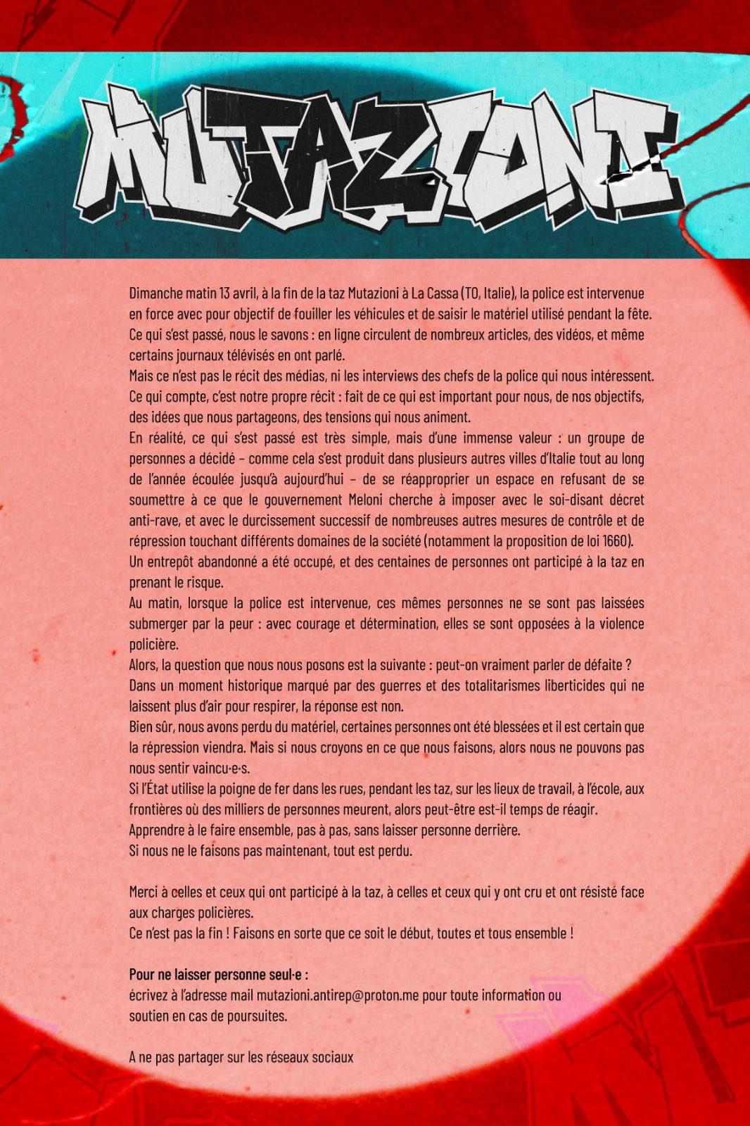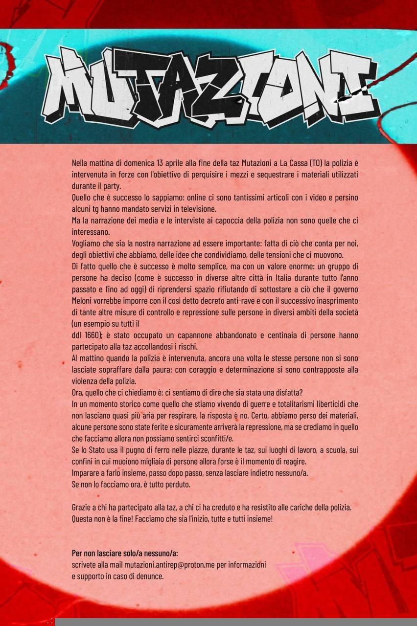 Il 12 aprile a La Cassa in provincia di Torino, la polizia è intervenuta alla taz Mutazioni: ci sono state cariche alle quali le persone hanno risposto determinate a non mollare, veicoli danneggiati da manganelli e lame, persone ferite, materiale sequestrato, persone identificate e denunciate.